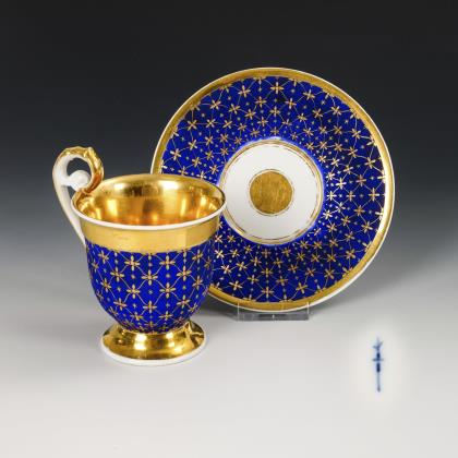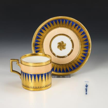 Modell "Konisch". Goldbordüre und königsblauer Fond, schauseitig eine goldgerahmte Rechteckkartusche mit der Darstellung je einer im Stil des Empire gekleideten Dame