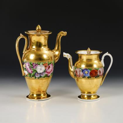 Ovoide Kannen mit Tierkopfröhrenausguß, geschwungenem Henkel und Knaufdeckel. Goldfond sowie ein umlaufendes Band mit Blumenmalerei vor goldenem Vermiculé-Fond