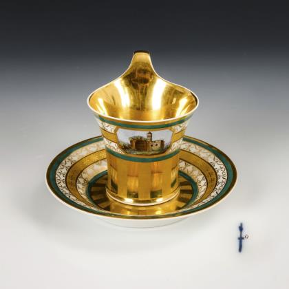 Zylindertasse mit Ohrenhenkel. Über einem goldenen Band mit Mäandermuster das umlaufend gemalte Panorama von Sanssouci, nach einem nach 1845 entstandenen Gemälde des Berliner Malers Carl Daniel Freydanck (1811-1887), innen vergoldet
