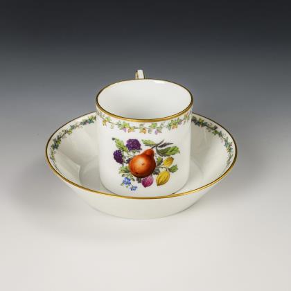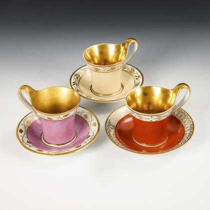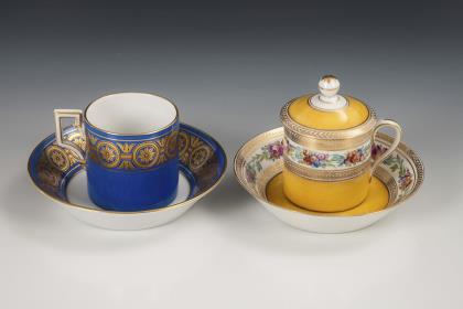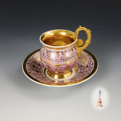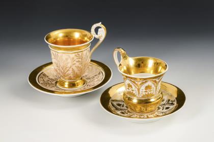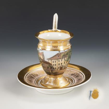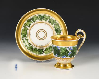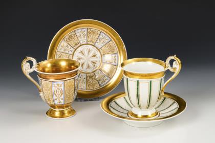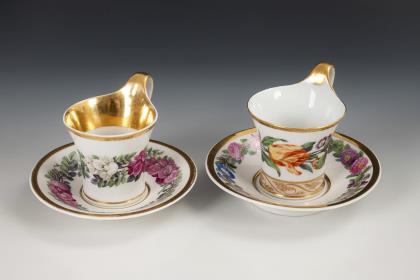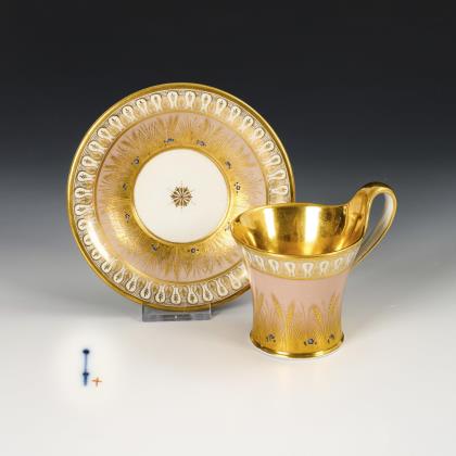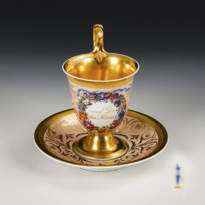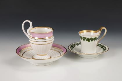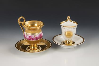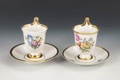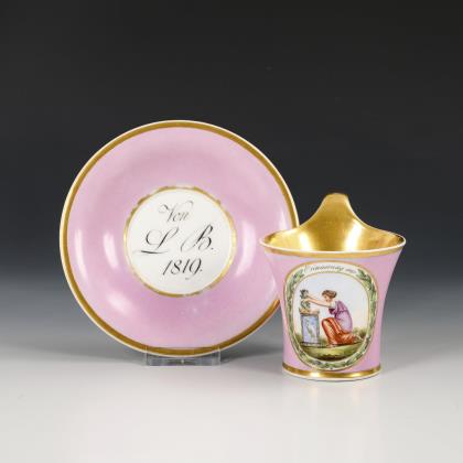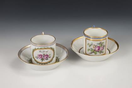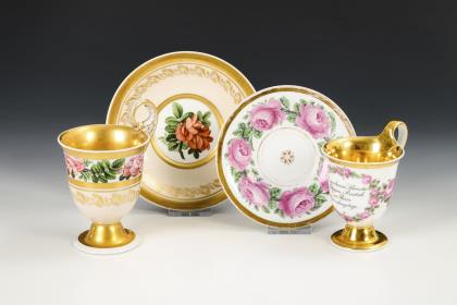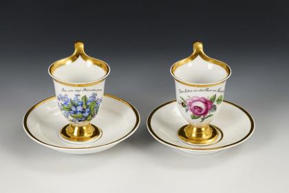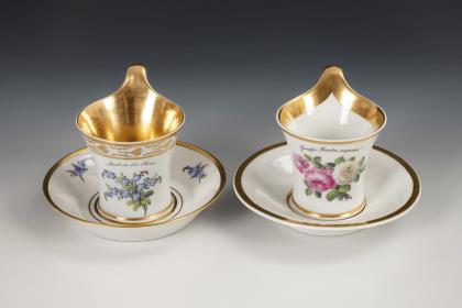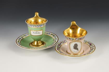 1x Zeptermarke, 1803-1813 mit blauem Malersignet (Kreis): Modell "Konisch" mit Campanerhenkel; unter einer Kleebordüre hellrosa Teilfond, schauseitig auf der Tasse ein goldgerahmtes Medaillon mit der Silhouette eines Herren und der Losung "Immer Dir nahe", innen vergoldet / 1x Zeptermarke mit rotem Malersignet, 1817-1823: gefußte Glockentasse mit Campanerhenkel; unter einer Vergißmeinnichtbordüre hellgrüner Fond, auf der Tasse eine Rechteckkartusche mit dem Namen "Wilhelm", im Spiegel der Untertasse das Datum "den 31ten July 1819.", innen vergoldet