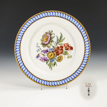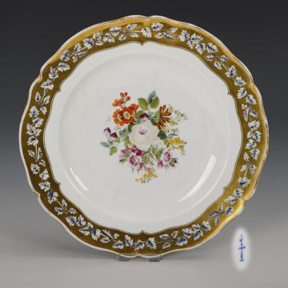 Mehrpassiger Teller. Auf der Fahne ein goldenes Fondband mit blauer Weinlaubranke in Reservetechnik, im Spiegel ein Blumenbukett mit Rose, Nelken und Aurikeln