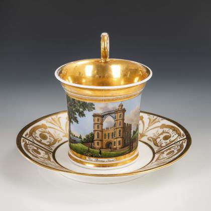 Zylindertasse mit Kraterrand und Löwenkopfhenkel. Schauseitig eine goldgerahmte Rechteckkartusche mit der bezeichneten Ansicht des Schlosses auf der Pfaueninsel bei Potsdam, verso vegetabile Goldmalerei