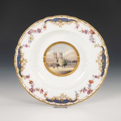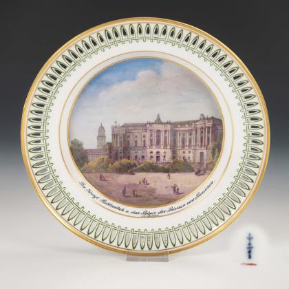 Dessertteller mit Spitzbogendurchbruch an der Fahne, im Spiegel eine goldgerahmte Rechteckkartusche mit der bezeichneten Ansicht der Königlichen Bibliothek und des Palais des Prinzen von Preußen