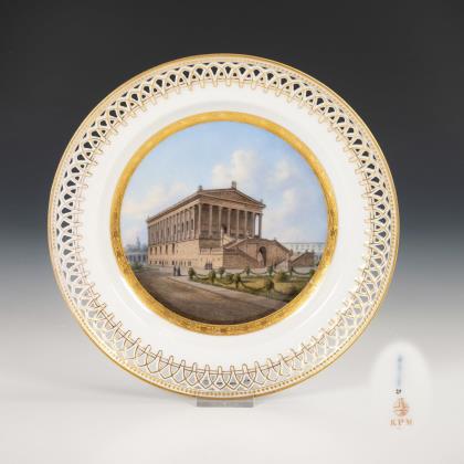 Modell "Englischglatt". Dessertteller mit durchbrochener Fahne, im Spiegel ein goldgerahmtes Medaillon mit der verso bezeichneten Ansicht der Nationalgalerie in Berlin