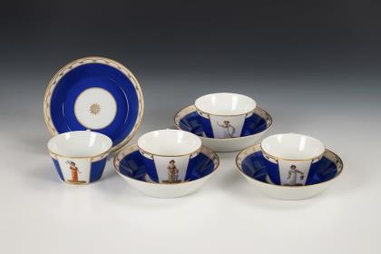 4 Empire-Tassen mit Modefiguren. KPM Berlin.