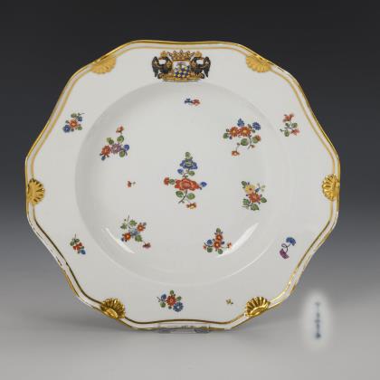 Aus einer ergänzenden Lieferung der KPM Berlin für das von der Porzellanmanufaktur Meissen gefertigte Speiseservice für Heinrich Graf von Podewils (1696-1760). Mehrpassiger Suppenteller mit sechs reliefierten Jakobsmuscheln am Rand und indianischer Blumenmalerei. Auf der Fahne das von zwei preußischen Adlern gehaltene, bekrönte Wappen derer von Podewils auf einer mit Lorbeerzweigen dekorierten Konsole