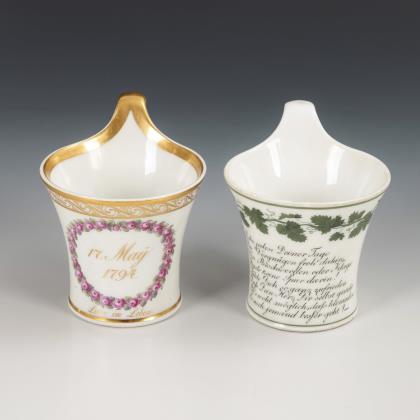 Modell "Konisch" mit Campanerhenkel. 1x Zeptermarke, um 1800: mit der Darstellung eines Vergißmeinnichtstraußes und der Bezeichnung "Auch in der Ferne", innen vergoldet. / 1x Zeptermarke und rotbraune Adlermarke, 1823-1832: mit der Darstellung eines Rosenstraußes mit der Bezeichnung "Genieße Freuden ungestört!"