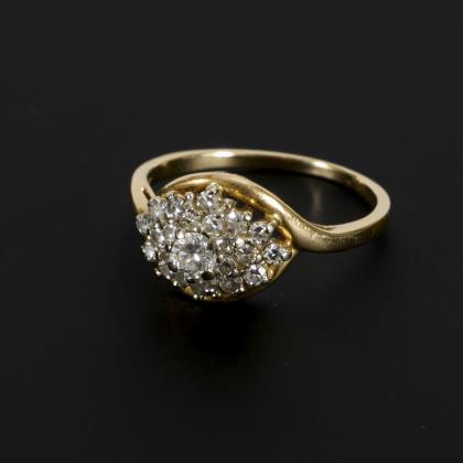 Ring mit zuckerhutartig erhöht angeordnetem Cluster aus krappengefassten Diamanten