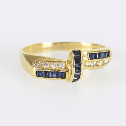 Ring in Knotenform mit 8 kleinen, pavégefassten Brillanten sowie kanalgefassten blauen Farbstein-Carrés, wohl Saphiren