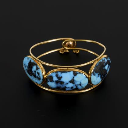 Breiter Vintage-Armreif mit 3 großen, zargengefassten Türkis-Cabochons. Rückseitig mit einem Verschluss zum Einhaken sowie einem zu öffnenden Sicherheitskettchen mit Federringverschluss