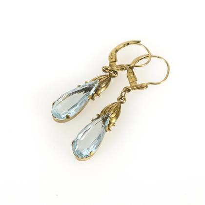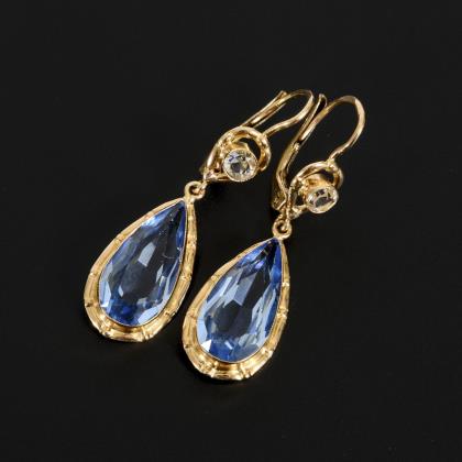 Ohrhängerpaar mit je einem großen, tropfenförmigen Schmuckstein in einem leuchtenden, hellen Blauton als Abhängung, darüber in einem tropfenförmigen Goldelement je ein kleiner, heller Schmuckstein in runder Form