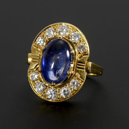 Ring mit großem, ovalem Ringkopf, dieser besetzt mit einem krappengefassten, ovalen Saphir-Cabochon, umgeben von 10 eingelassenen Brillanten