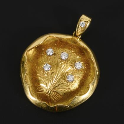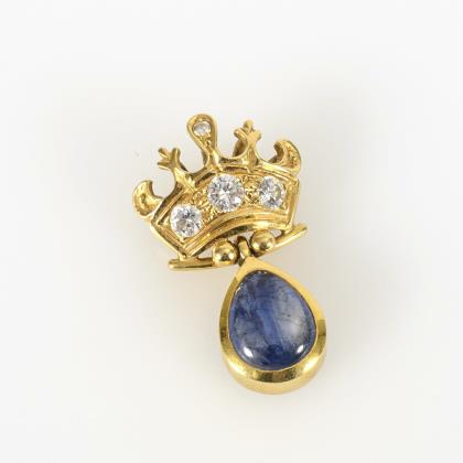 Anhänger in Form einer Krone, diese mit 3 größeren und einem kleineren Brillanten besetzt, darunter als Abhängung ein tropfenförmiger Saphir im Cabochonschliff. Rückseitig mit einer Folge starrer Ösen