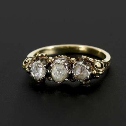 Ring mit 3 in Silber gefassten, historischen Diamanten im Rosenschliff, diese in einen historisierend gestalteten Ringkopf eingepasst