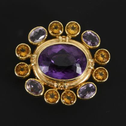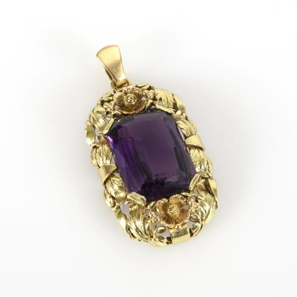 Collier in barockisierender Formgestaltung, ausgefasst mit insgesamt 6 farblich getönten, tropfenförmigen Brillanten im Antwerpener Rosenschliff, der größte in gelblicher Färbung, als bewegliche Abhängung gearbeitet