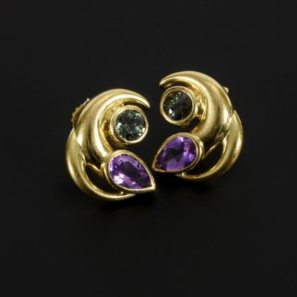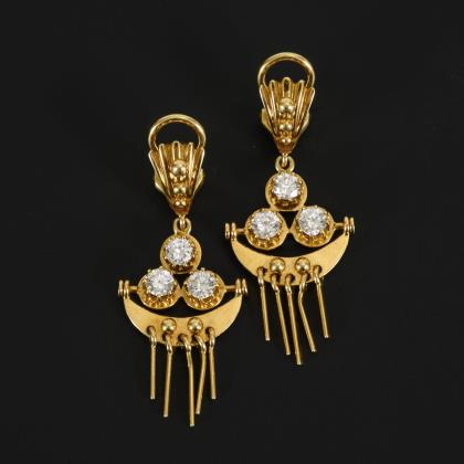 Ohrringe, 2. Viertel 20. Jh., mit tropfenförmigen, krappengefassten Farbstein-Imitationen (Glas). Verschluss: Wiener Brisur