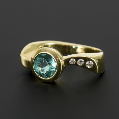 Ring mit asymmetrisch gestalteten Ringschulter, diese auf einer Seite mit 3 Achtkant-Diamanten besetzt, zentral ein zargengefasster, rundfacettierter Turmalin der seltenen blau-grünen Farbvarietät Paraíba
