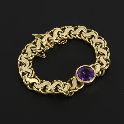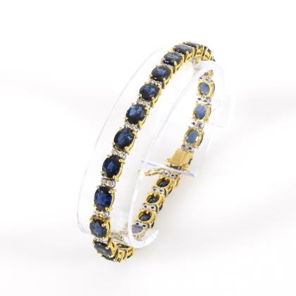 Zweifarbiges Armband mit 23 in Gelbgold krappengefassten Saphiren im Ovalschliff und alternierend dazu kleineren Gliedern mit einem Besatz aus 46, davon je paarweise in Weißgold gefassten kleinen Brillanten. Das Kastenschloss mit doppelter Achtersicherung