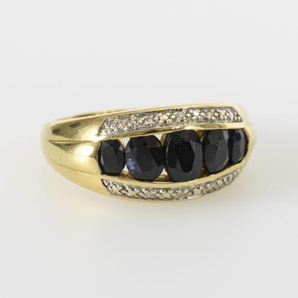 Ring mit ovalfacettierten blauen Farbsteinen, wohl Saphiren, im Verlauf, diese zu beiden Längsseiten je von einem Band aus kanalgefassten, kleinen Diamanten umgeben