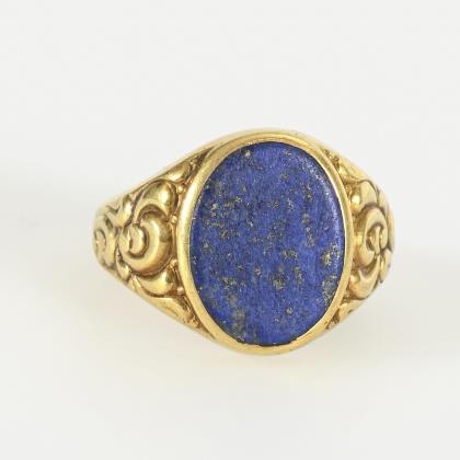 Älterer, großer Ring mit ovaler Lapis Lazuli-Tafel zwischen ornamental gestalteten Ringschultern