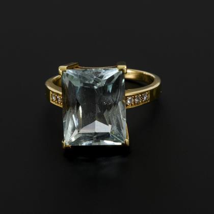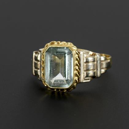 Ring mit einem hellblauen, in Gelbgold zargengefassten Farbstein zwischen in Weißgold gürtelartig gestalteten Ringschultern