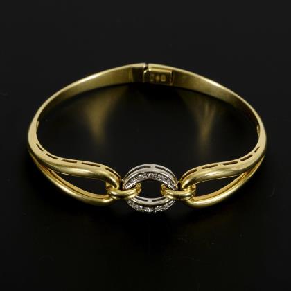 Zweifarbig gestalteter Armreif mit einem leicht beweglichen Mittelelement, dieses mit kleinen, pavégefassten Achtkant-Diamanten besetzt und durch 2 bewegliche Ringe mit den schlaufenartigen Reifelementen verbunden. Mit Kastenschloss