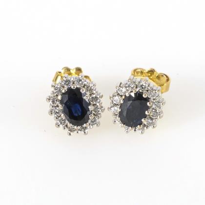 Ohrstecker mit Entourage-Elementen mit je einem blauen, oval-facettierten Farbstein, wohl Saphir, dieser von kleinen Brillanten umgeben