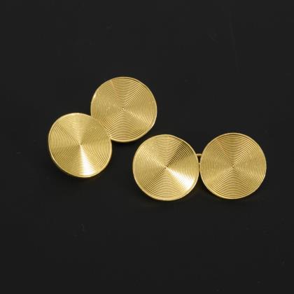 Runde Manschettenknöpfe mit Kettenverbindung der Marke CARTIER. Die Schauseiten sind jeweils mit einem Muster aus engen konzentrischen Kreisen graviert
