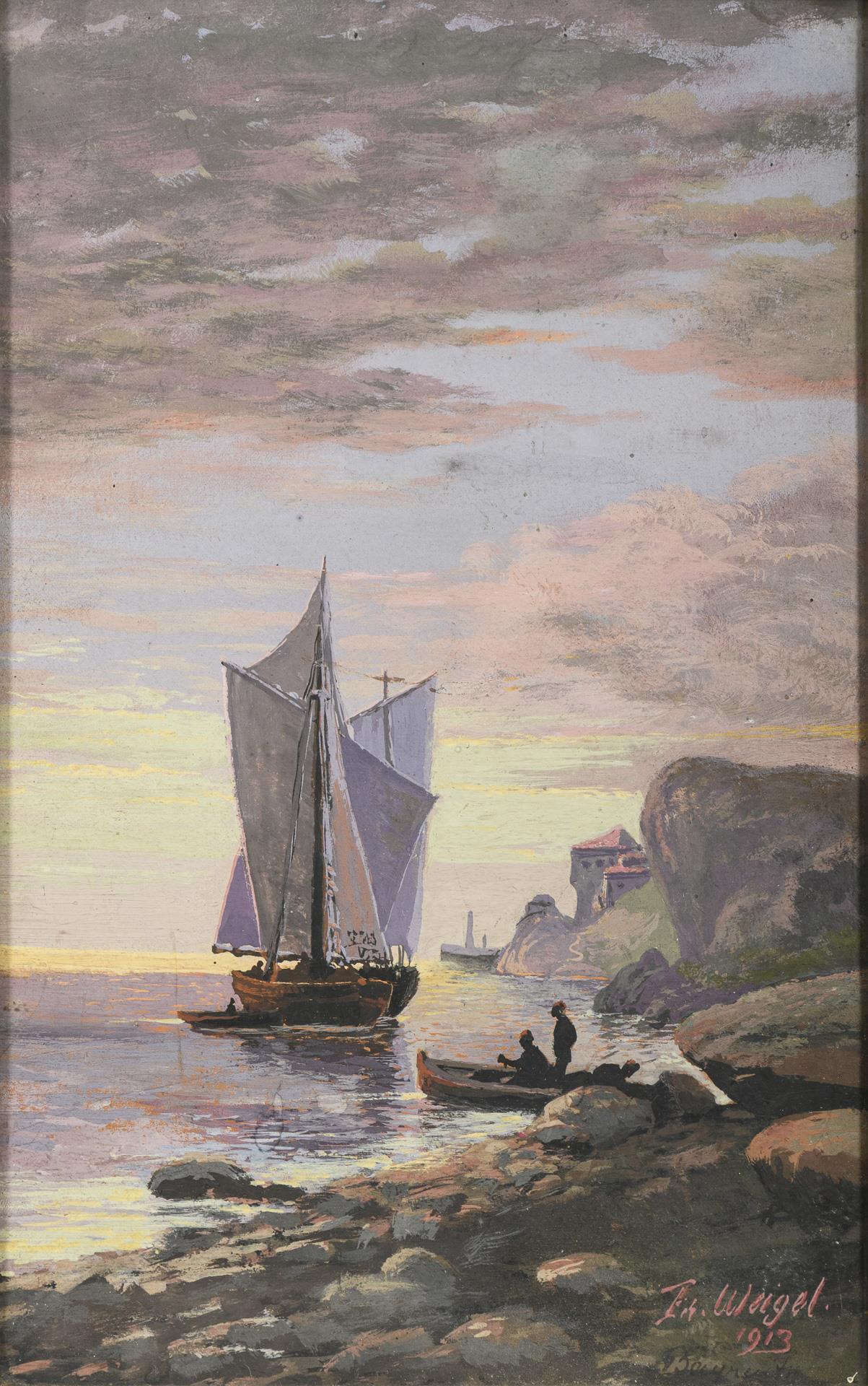 WEIGEL, Th.. Abendliche Küstenlandschaft mit Segler.