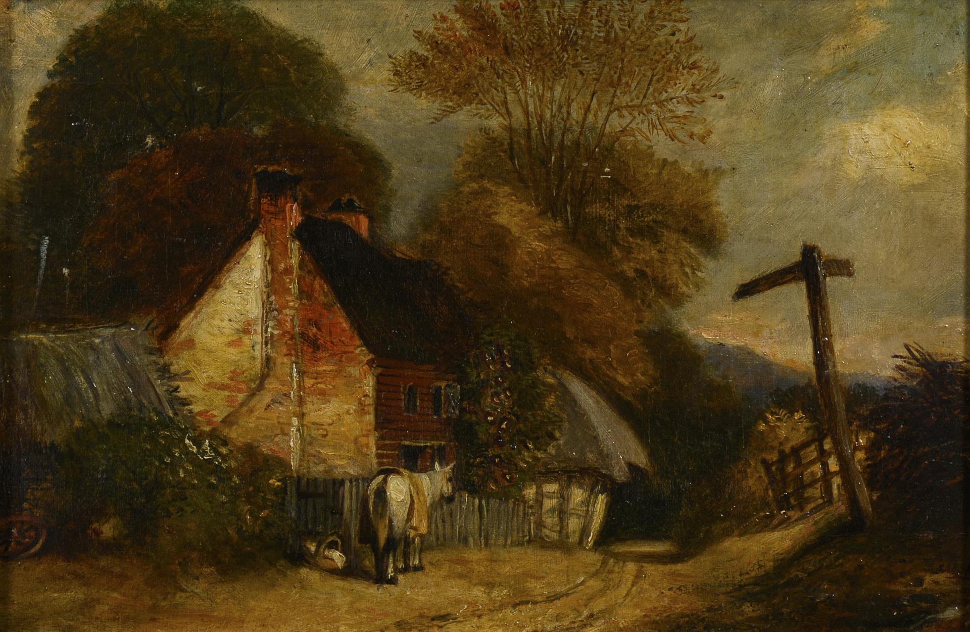 Monogrammist "FB": Gehöft in sonniger Landschaft.