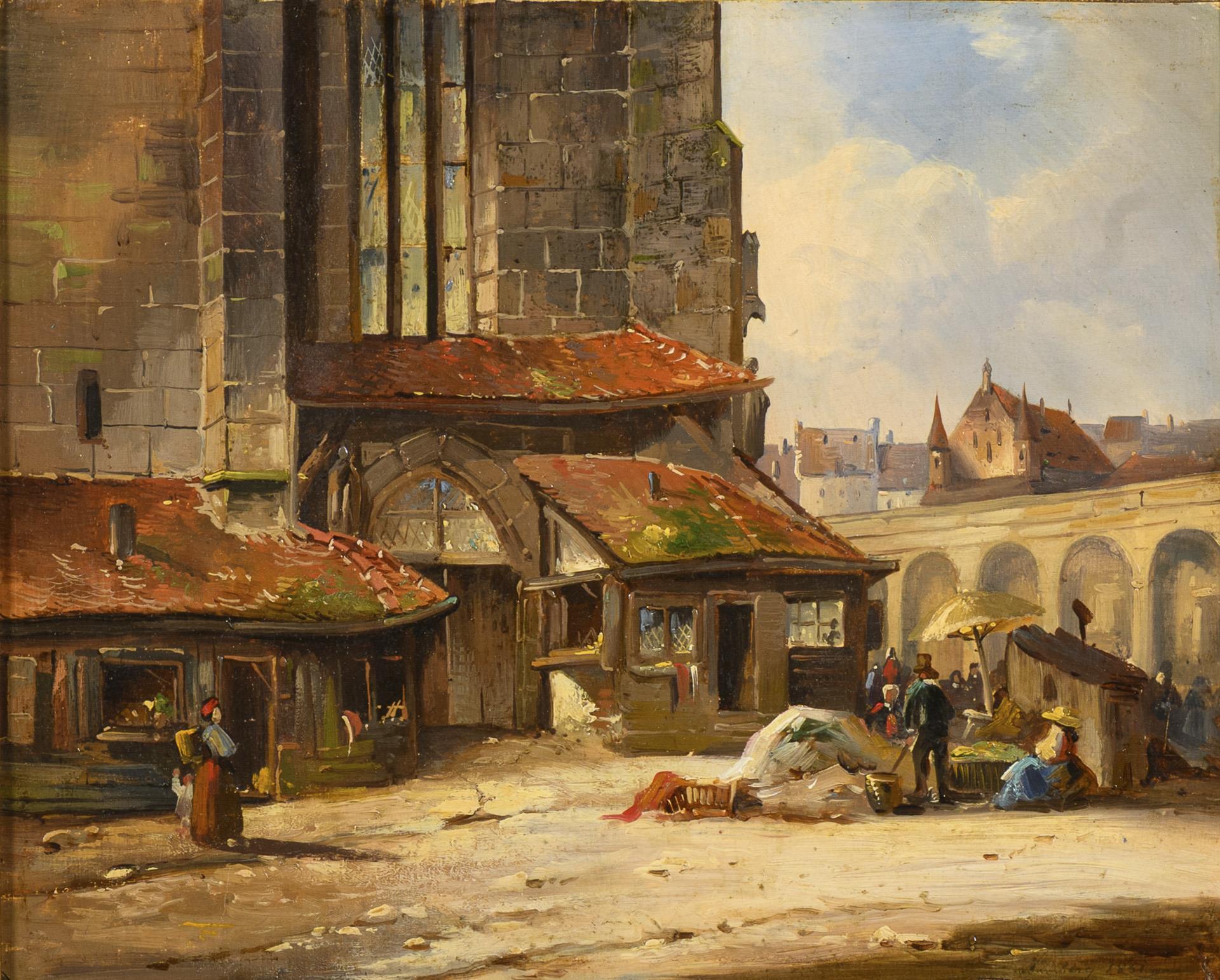 Straßenszene mit Staffagefiguren vor einem großen Haus mit Brunnen