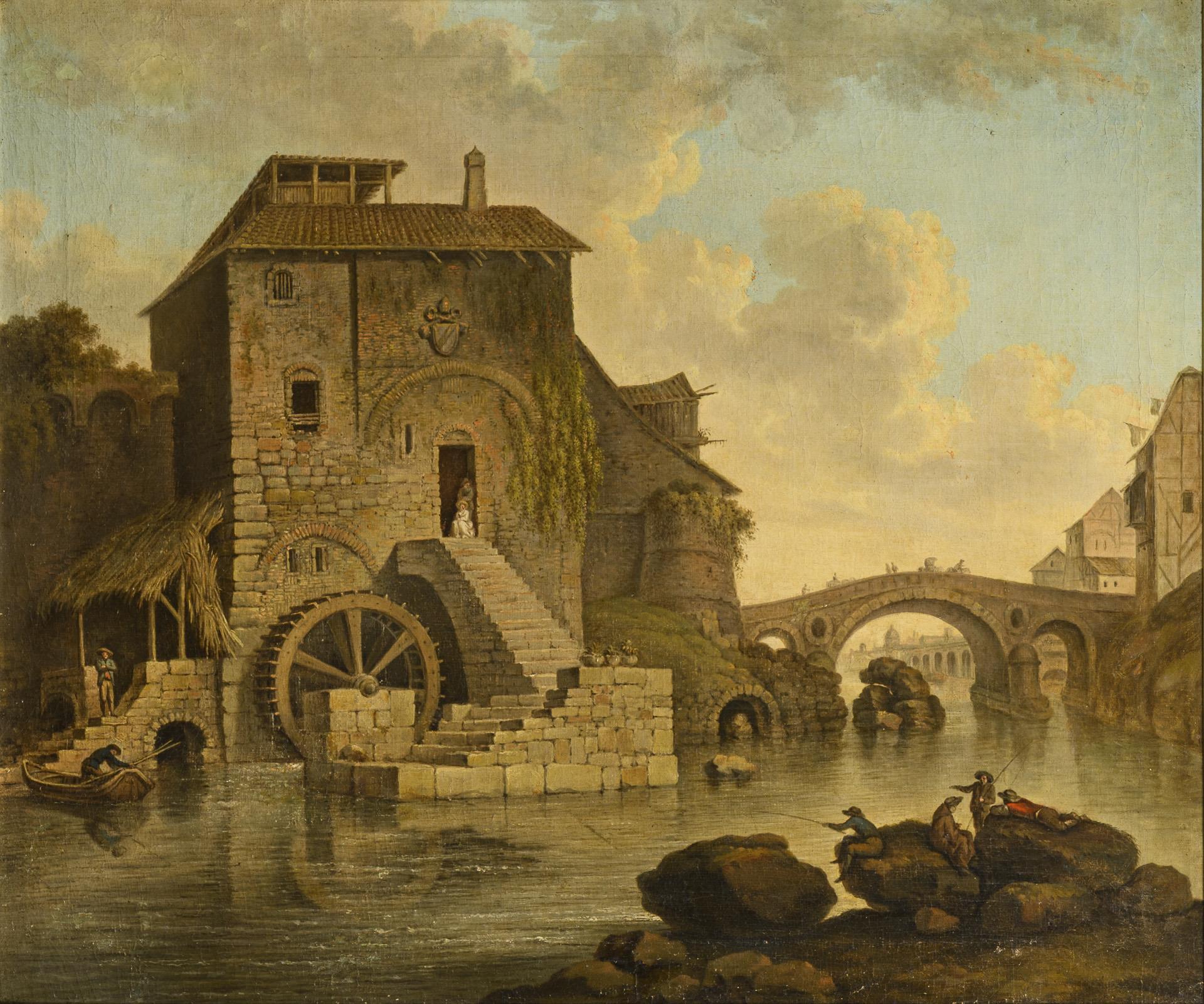 Stadtansicht mit detailliert gemalter Mühle an einem Fluss mit Anglern