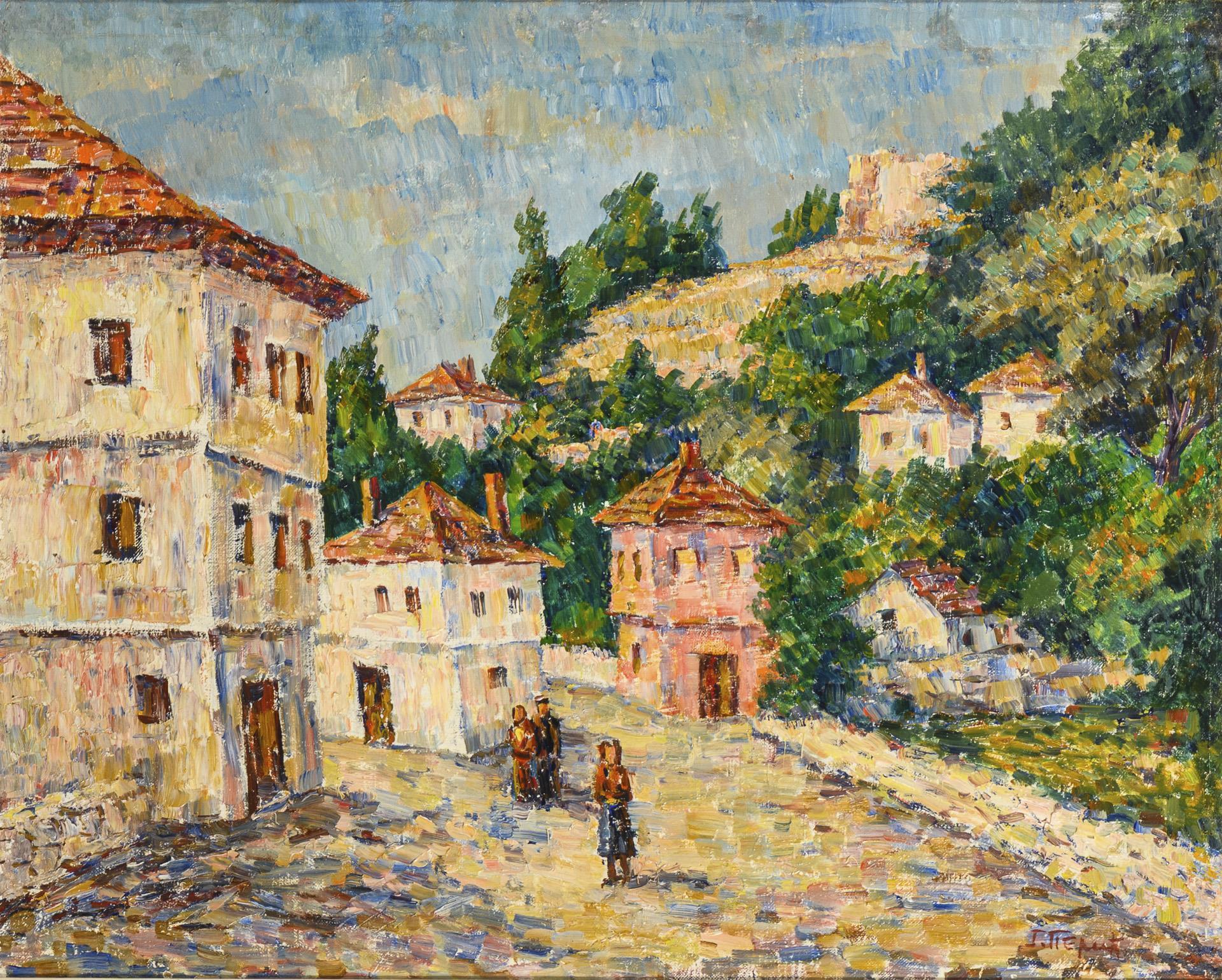 Impressionistisch angelegte Ansicht, in großzügigem Pinselschlag ausgeführte Szenerie in hellem Kolorit. Profilierter Rahmen