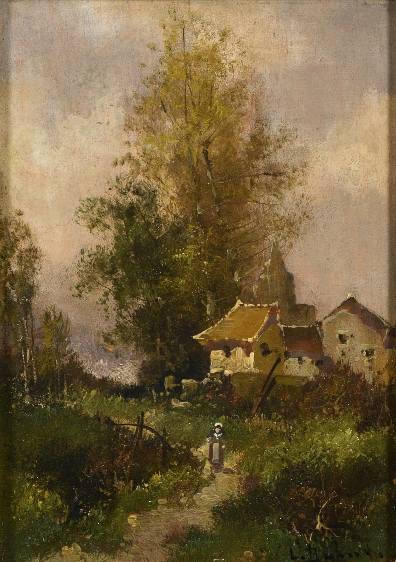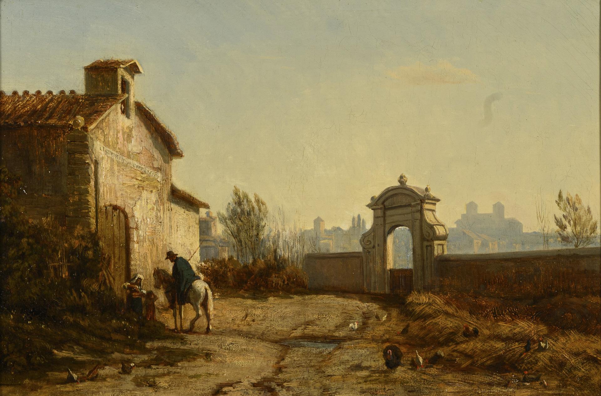 Staffagefiguren auf einem Weg nahe dem Dorf bzw. zwei Bauern im Gespräch an einem Tor