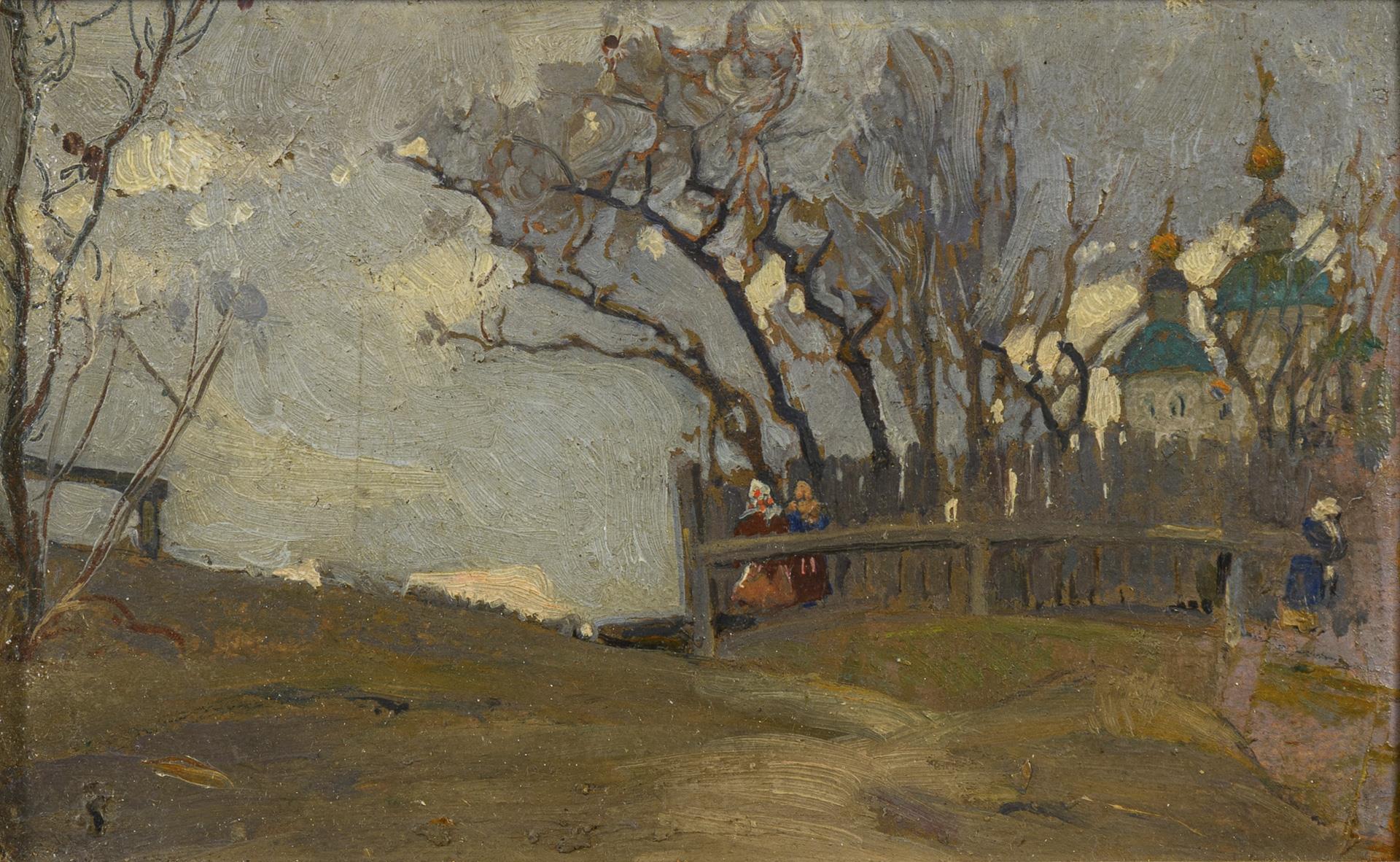 Atmosphärische Ansicht in verhaltenen, ausgewogenen Tönen. Profilierter Waschgoldrahmen