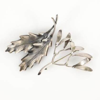 2 Broschen in naturalistischer Ausgestaltung, eine in der Form eines Mistelzweigs nach einem Entwurf der Künstlerin Gertrud Engel, die andere in Form zweier sich überlappender Eichenblätter. Je mit Kugelhakenverschluss
