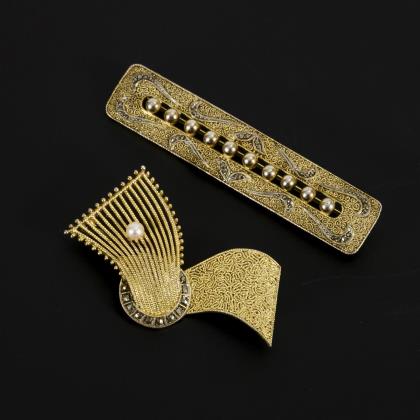 2 Theodor Fahrner-Broschen mit Ausgestaltung in Silberfiligran der 1940er oder 1950er-Jahre, eine in Wellenbandform, die andere als breite Stabbrosche gestaltet. Je mit Markasiten ausgefasst, auf der Wellenbandbrosche zusätzlich eine künstliche Perle aufgebracht. Die Nadel je mit Kugelhakenverschluss