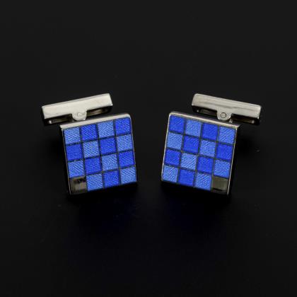 Manschettenknöpfe der Marke Louis Vuitton, Design "Damier". In zwei verschiedenen Blautönen schachbrettartig emaillierte Schauseiten mit unterliegender Guillochierung