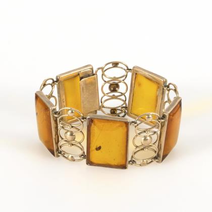 Armband mit großen Bernstein-Tafeln und elliptischen Zierelementen in Gold. Rückseitig an einer Tafel ein einfacher Verschluss zum Einhaken, dieser mit Sicherungskettchen