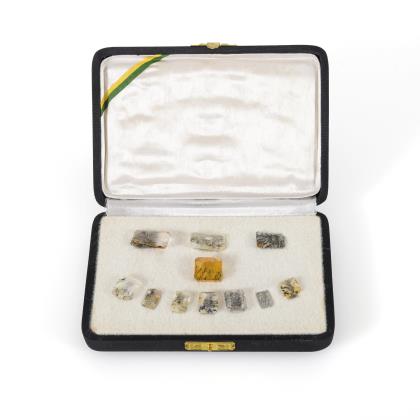 Alte Sammlungsschatulle mit insgesamt 11 Moosachaten in leicht changierender Farbe, verschiedenen Größen und Schliffen