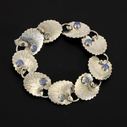 Vintage-Armband des in Schweden tätigen Designers ARVO SAARELA mit Gliedern in Form von Seerosenblättern, diese je mit einem Mondstein-Cabochon besetzt