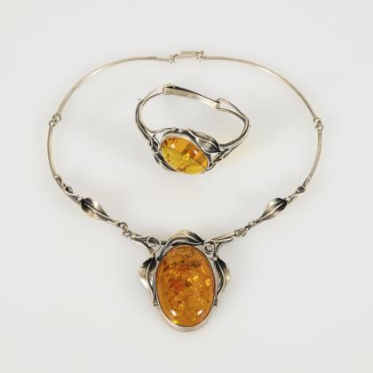 Bernstein-Collier und darauf abgestimmter Armreif mit je einem großen Bernstein-Cabochon in Zargenfassung, umgeben von blattähnlichem Zierwerk
