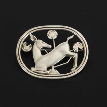 Ovale, durchbrochen gearbeitete Brosche mit kniender Hirschkuh zwischen stilisierten Blättern nach einem Entwurf von Arno Malinowski für Georg Jensen. Die Nadel mit Kugelhakenverschluss