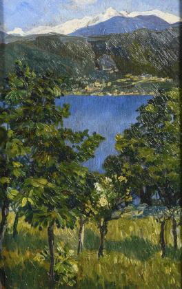 Teils blühende Bäume auf grüner Wiese oberhalb eines Sees mit den weißen Berggipfeln unter blauem Himmel im Sonnenschein