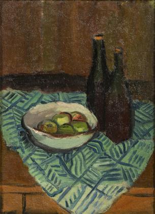 Eine Schüssel mit Äpfeln neben zwei Flaschen auf einem gemusterten Tuch