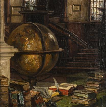 Viele Bücher auf einem Tisch bei einem großen Globus
