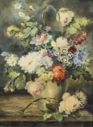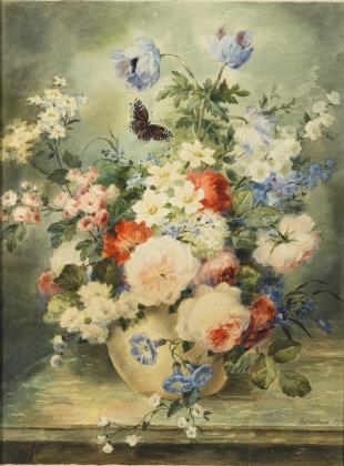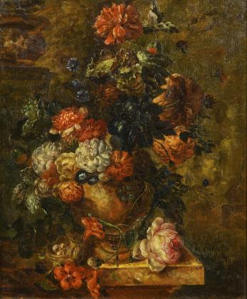 Im Stil der Altmeister arrangiertes Bukett mit vielen verschiedenen Blüten in einer antikisiernden Vase auf einem Sims