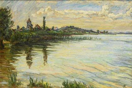 Blick entlang des Ufers zu den Gebäuden des Ortes unter bewegtem Wolkenhimmel