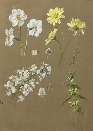 Margariten, Kastanienblüten, Narzissen und Taubnesseln auf belassenem Grund
