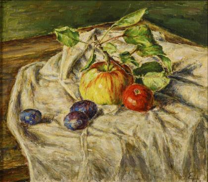 Äpfel und Pflaumen auf einem weißen Tuch auf dem Tisch